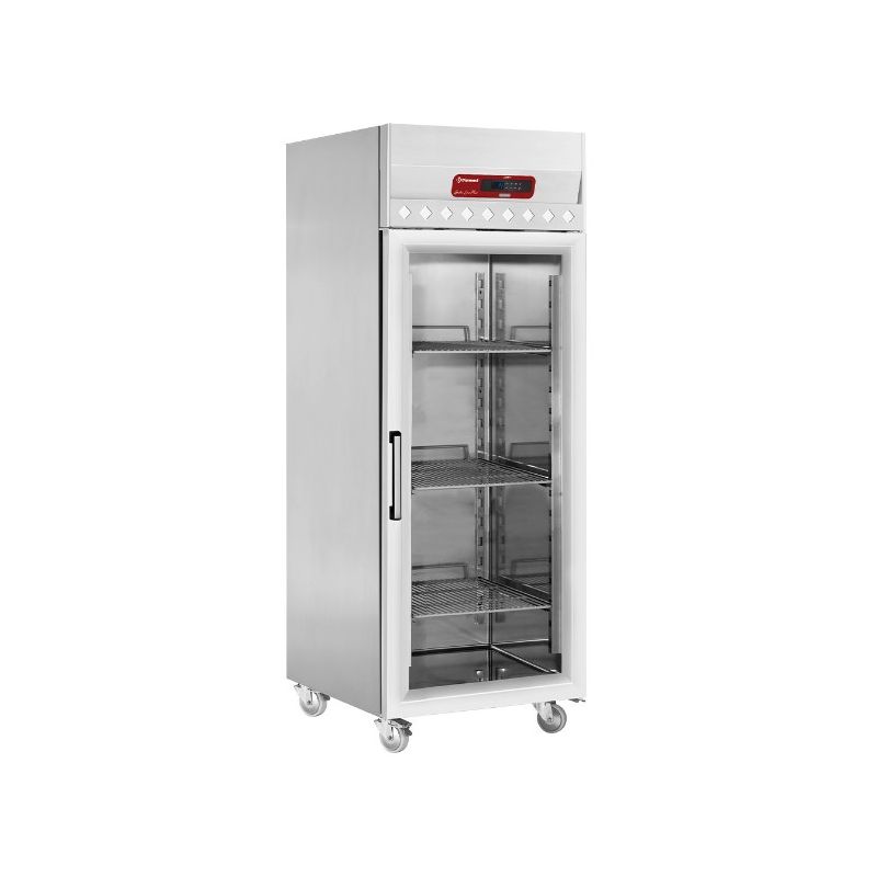 - Porte vitrée (double vitrage) avec poignée (prédisposition pour serrure a clés), fermeture assurée par joint magnétique "a pression" (remplacement aisé, sans outillage), charnières avec arrêt à 100° et fermeture portes avec rappel automatique