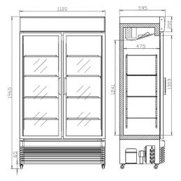 Dimensions (LxPxH): 1350x845x2145 mm - T° : -2°C /+8°C / 28°F/46°F - Étagères: 6+3 - capacité : 1404 L - Type de fluide réfrigérant: R290 - puissance frigo : 845W - consommation : 373 W électrique