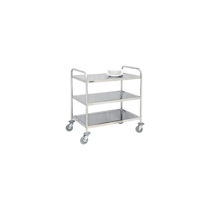 Dim:92x60x94.5cm -Plateau:83x51cm -Distance entre plateaux: 57cm -Inox -Charge utile:120Kg -4 roues dont 2 avec frein -Poids: 10 kg