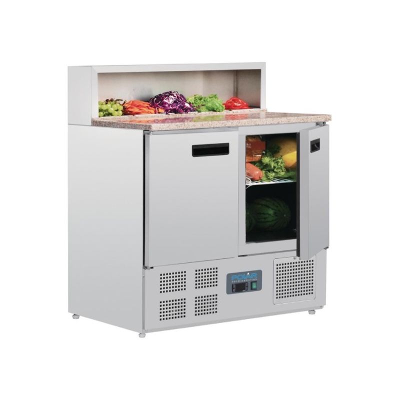 Comptoir de préparation à pizza et à salade composé d'un plan de travail en marbre et d'un espace réfrigéré gastronorme pouvant contenir 5 bacs x 1/6 de profondeur 150mm (vendus séparément).