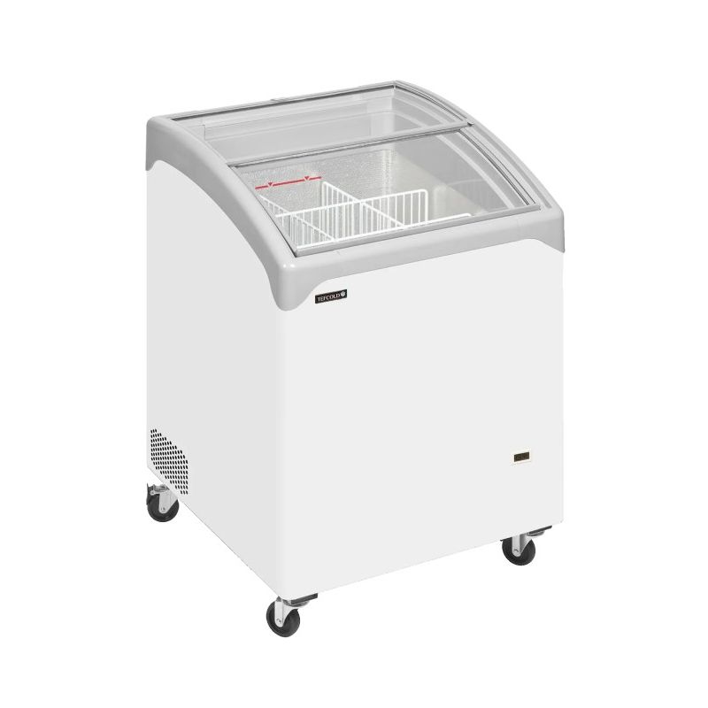 2 couvercles coulissants plats verre trempé Réfrigération statique Avec 1 panier et serrure 4 roulettes, 2 avec frein Plage de température : -24 à -14 °C Classe climatique : 5 Classe énergétique : D Poids brut / net : 65 / 55 kg Volume brut / net : 296 / 255 l Fluide frigorigène : R290