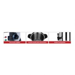Structure en ABS noire. Panneau de commandes mécaniques. Robinet vertical facile à nettoyer et à démonter. Température réglable par thermostat jusqu'à 90°C. Alimentation : MONO 230 V.