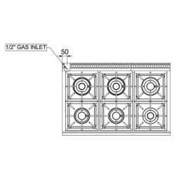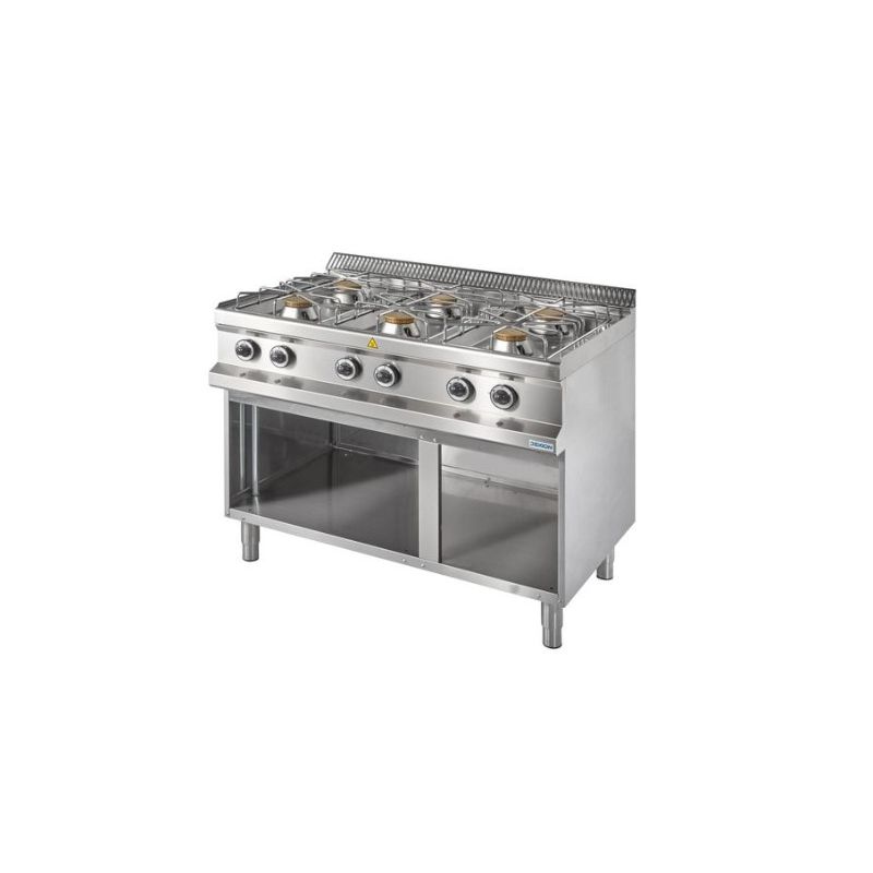 8 brûleurs (2x 10 kW et 6x 6 kW). 2 fours GN 2/1, dimensions 575x700xh300 mm (2x 8,5 kW). Réalisation en acier inox AISI 304
