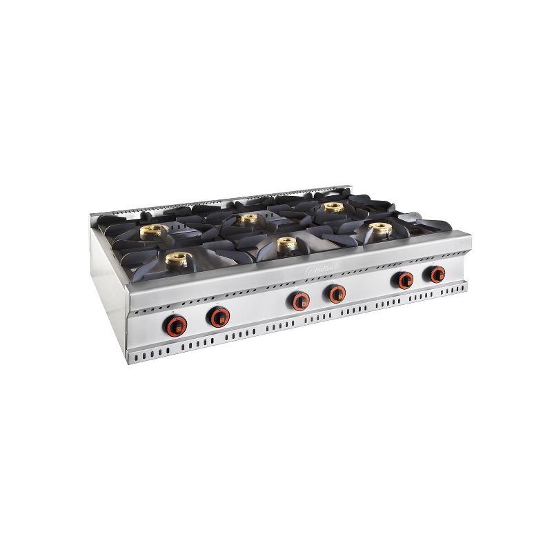 6 feux : 3 brûleurs 5,25 Kw + 2 brûleurs 8,0 Kw + 1 brûleur 10,2 Kw 1 four statique panoramique : 1000 x 700 x 290 mm Puissance four : 14,00 kW Série 900 FAGOR Alimentation au gaz naturel ou propane