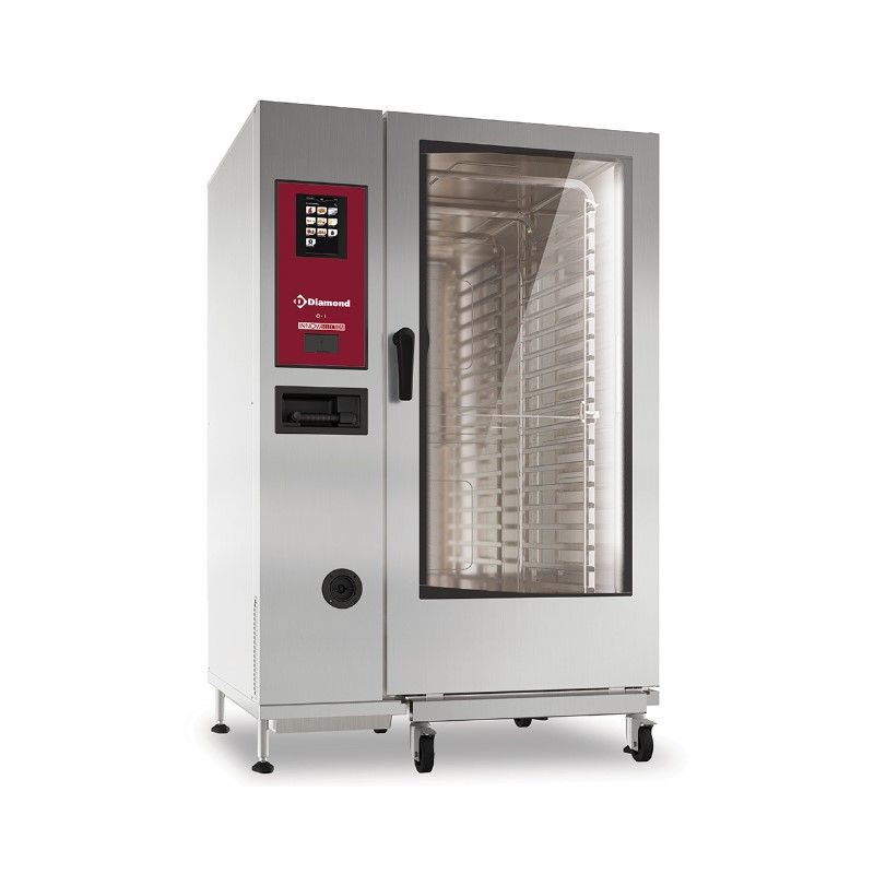 Porte à double vitrage: poignée ergonomique et athermique, fermeture automatique avec sécurité évitant toutes ouvertures accidentelles, récupérateur de condensation intégré dans la porte, vitre intérieure montée sur charnières, facilitant le nettoyage garantissant une hygiène parfaite. Une circulation d'air entre les vitres garantit une meilleure isolation thermique. Micro-interrupteur pour l'arrêt du ventilateur lors de l'ouverture. Éclairage LED latéral permettant une vision globale de l'enceinte. Chauffage électrique : par résistances blindées circulaires inoxydables placées derrière les déflecteurs du ventilateur, vapeur : par résistances blindées inoxydables dans un boiler extérieur. Panneau de commandes "TOUCH SCREEN" de 7" avec, accessibilité frontale, facilité et rapidité pour le SAV, indice de protection IPx5 (contre les jets d'eau à la lance).