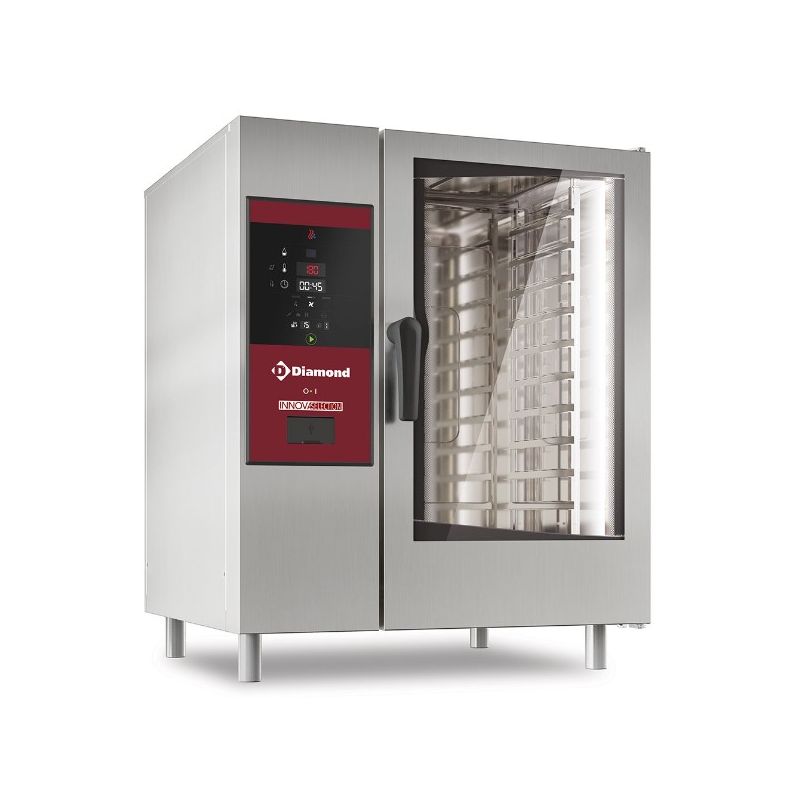 Construction intérieure et extérieure en acier inox AISI 304, isolation thermique en fibre céramique, panneau de commande muni d'un filtre inox, évitant l'encrassement des composants (panneau ventilé), pieds en inox. Enceinte de cuisson: entièrement soudée, étanchéité totale, coins et angles arrondis sans aspérités. Joint d'étanchéité fixé sur la face avant de l'enceinte de cuisson. Fond à double emboutissement qui sépare la condensation des graisses vers la décharge. Condenseur de vapeur de série réduisant la température des condensats à l'évacuation et limitant la sortie de vapeur à l'ouverture de la porte. Structure porte platine facilement amovible. Diffuseurs de chaleur facilement démontables. Oura motorisée largement dimensionnée permettant toutes les cuissons. Conception unique de l'enceinte couplée à un ventilateur latéral en acier inox AISI 304 (CCRR) garantissent une gestion et une distribution uniforme de la chaleur.