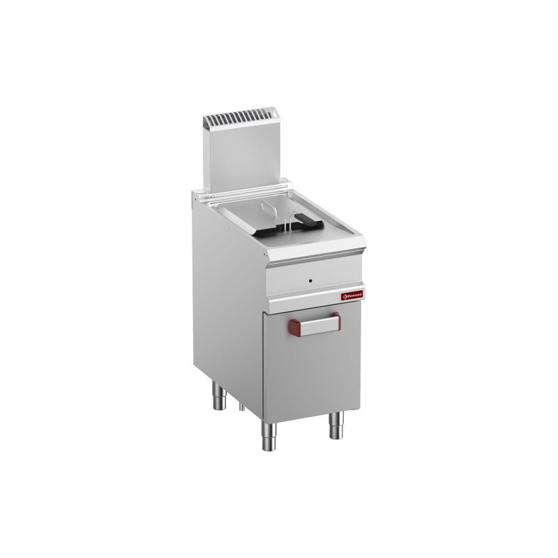 - Cuve "emboutie" en acier inox AISI 304 avec tous les coins et angles intérieurs arrondis pour un entretien facile et hygiénique, munie d'une zone froide. Couvercle en acier inox. Robinet de vidange (à bille) de la cuve ainsi que le bac de décantation de l'huile, placés dans l'armoire inférieure.