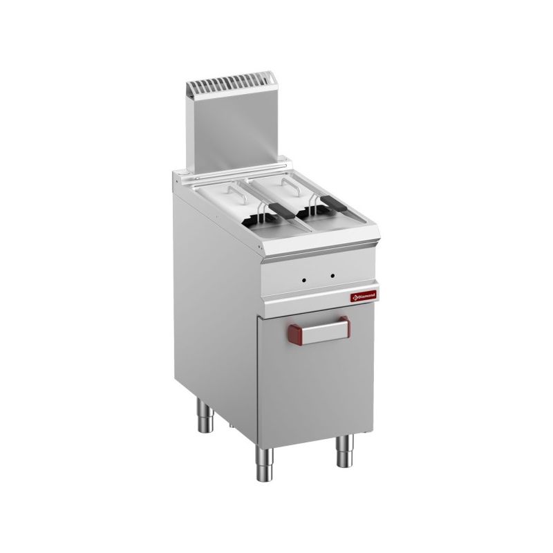 - Cuve "emboutie" en acier inox AISI 304 avec tous les coins et angles intérieurs arrondis pour un entretien facile et hygiénique, munie d'une zone froide. Couvercle en acier inox. Robinet de vidange (à bille) de la cuve ainsi que le bac de décantation de l'huile, placés dans l'armoire inférieure.