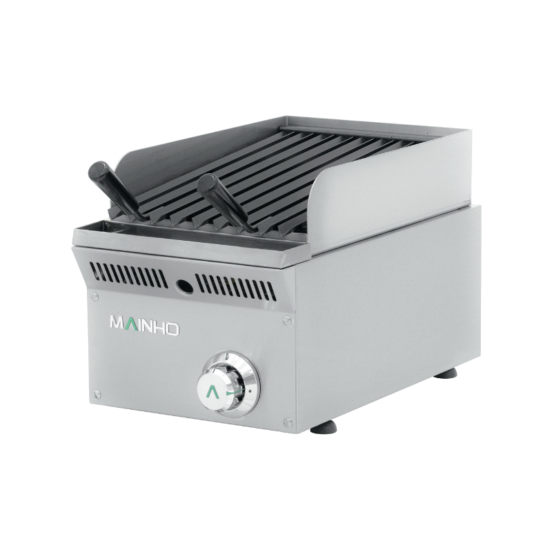 La solution professionnelle idéale pour tous types de grillades poissons ou viandes (extérieur/intérieur) avec un rendement important, une saisie immédiate grâce à sa puissance et un résultat façon barbecue. Ce sont des produits incontournables pour les spécialistes de la grillade de viandes. Un large plan de cuisson constitué d'un grill avec collecteur de jus de cuisson, (goulotte en inox) et protégé par une rehausse inox sur les bords du barbecue. Le panier de pierre de lave volcanique (Qualité MAINHO) est indépendant et facilement extractible pour le nettoyage. Le brûleur en inox émaillé et vitrifié peut être alimenté en gaz propane butane ou gaz naturel.