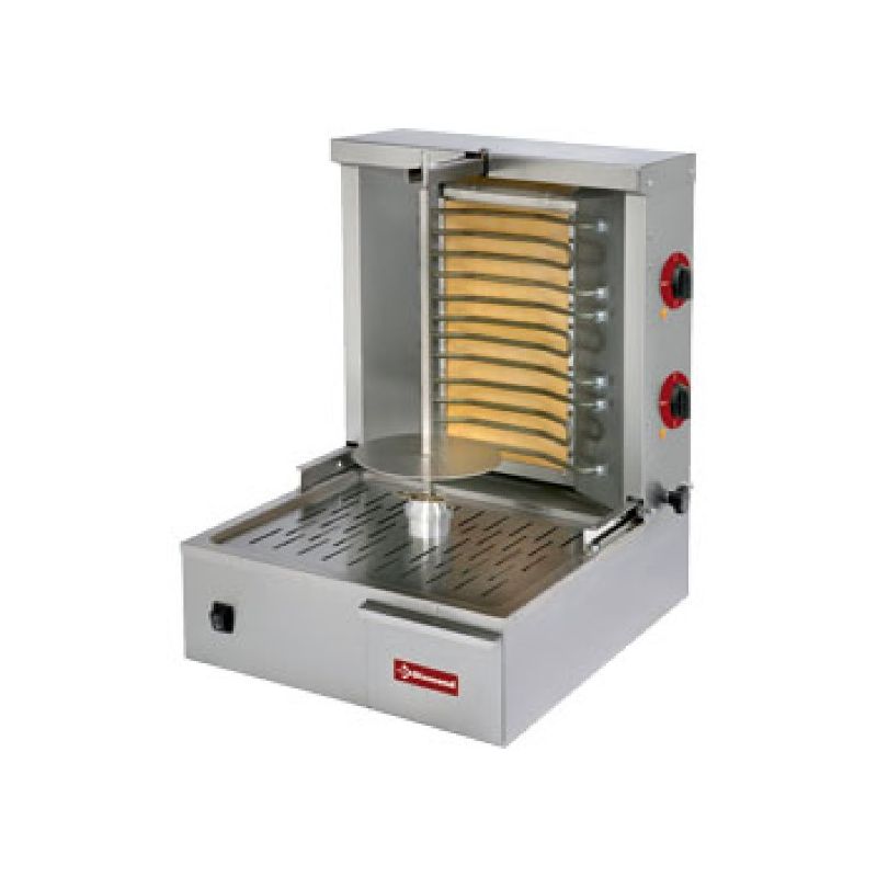 Max du Kebab : 100 kg Diamètre du Kebab : 46 cm Hauteur max du Kebab : 63 cm Unité de cuisson gaz : 4 Radiants GPL/GNL La consommation de gaz : 1.5 m3/heure Unité de cuisson électrique : 7.8 kW