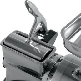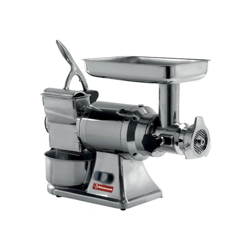 Combiné hachoir n°22 à viande et râpe à parmesan Combiné hachoir n°22 à viande et râpe à parmesan - Châssis extérieur en "alliage d'aluminium" - Le corps de l'hachoir ainsi que la vis sans fin interne sont également réalisé en "alliage d'aluminium" traité alimentaire, toutes les parties internes se démontent facilement permettant ainsi un entretien aisé.- Cuvette supérieure en acier inox Aisi 304.- Livré standard avec grille 6 mm- Grille et couteau en inox à "auto-aiguisage"- Râpe parmesan à cylindre, avec levier supérieur ainsi que le corps du cylindre réalisé en "alliage d'aluminium" traité alimentaire.- Moteur ventilé, idéalement conçu pour un usage intensif.- Traction à engrenage sous bain d'huile- Commande à basse tension 24V- Production horaire : viande 300 kg/h, parmesan : 50 kg/h- Livré avec 2 récipients de récupération, un pour l'hachoir et un pour la râpe à parmesan, tous deux en acier inox Aisi 304.- Appareil construit dans le respect des normes (CE) en vigueur.