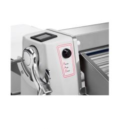 Dim: 2560x910x1340 mm- Largeur table : 1200 mm- Largeur tapis: 500 mm- Tapis vitesse: 500 mm/sec- Poids: 180 kg- Puissance: 0.55 kw- Ouverture cylindres: 0-3.50 mm- Ø Cylindres: 60 mm