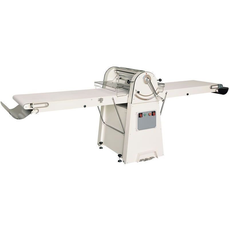 Dim: 2560x910x1340 mm- Largeur table : 1200 mm- Largeur tapis: 500 mm- Tapis vitesse: 500 mm/sec- Poids: 180 kg- Puissance: 0.55 kw- Ouverture cylindres: 0-3.50 mm- Ø Cylindres: 60 mm