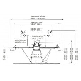 Dimensions: 1072x2900mm- Tapis : 605x2420mm- Longueur cylindre:633 mm- Vitesse du tapis de décharge: 50 cm/sec (1 vitesse)-Position de repos: 1072x1240mm-Poids: 160Kg