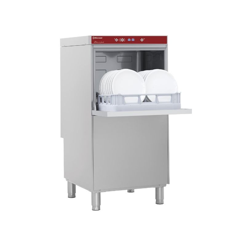 Réalisation : en double parois entièrement en acier inox AISI 304. De 60 à 24 paniers/heure, cycles 60'' - 120'' - 150" ou continu. Bras de lavage et de rinçage (supérieur et inférieur) rotatifs, (inferieurs en acier inox). Gicleurs en acier inox auto-nettoyants. Cuve (23 Lit., 2,1 kW) avec bords arrondis, fond "embouti ". Coulisses panier embouties, pas d'aspérité et pas d'incrustation de calcaire. Filtre en cuve "intégral", en acier inox "moulé".