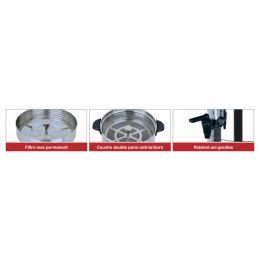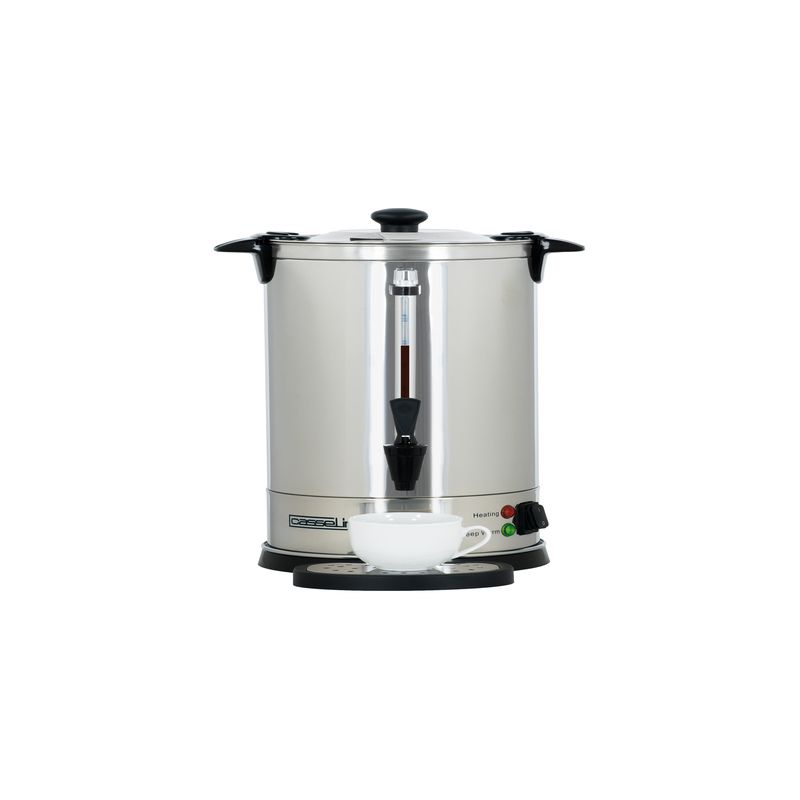 Dimension cuve:318x490mm Boîtier et couvercle en inox Double paroi anti-brûlure Indicateur de niveau Contenance : 20 litres Thermostat de température réglable de 30°C à 100°C Thermostat de sécurité avec bouton reset accessible Robinet anti-gouttes Puissance:2 500 W Poids : 3,58 Kg
