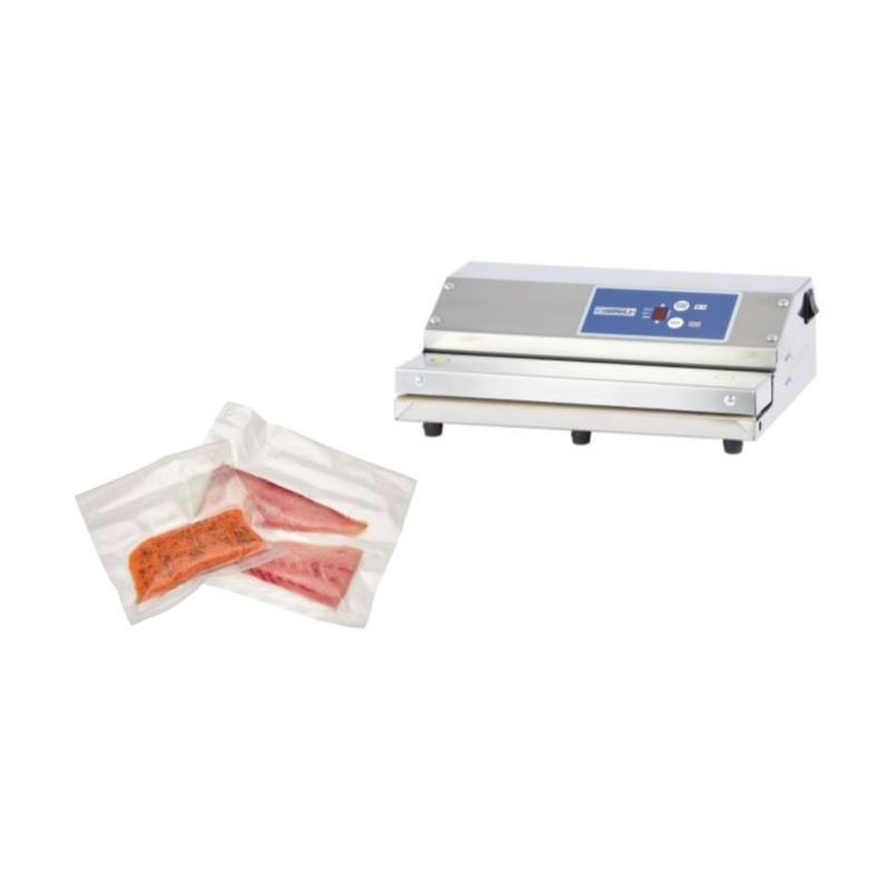 Dimensions d’encombrement : 510 x 560 x 450 Dimensions de la chambre : 410 x 450 x 220 h Pompe du vide : Q= 20 m3/h Barre de soudure : mm 400 Cycle de travail : 30-35 seconds, automatique Panneau des commandes : 20 programmes, Lcd, avec possibilité de régler le vide/la soudure avec +/-. Poids : 60 Kg