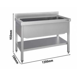 Avec espace lave-vaisselle Égouttoir gauche Réalisation en acier inox 18/10 AISI 304 en 12/10 mm Plan supérieur embouti et dosseret arrière de 85 mm Dimension cuves:400x500xh275 Fond extérieur des cuves revêtu d’un isolant phonique Crépines et bondes de trop-plein, vérins en inox réglables Tablette inférieure renforcée.