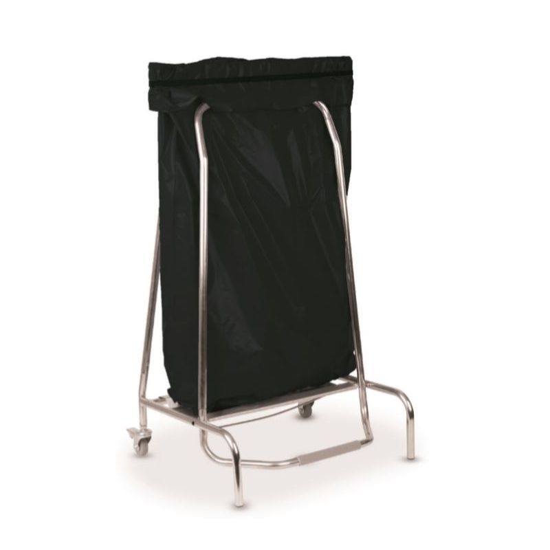 -Dim: 500x540x1255mm -Capacité 110L -Rebord pour déposer des plateaux -Clapet aimanté pour accéder à la poubelle -Sac poubelle tenu par un élastique -Chariot mobile aimanté sur 4 roues -Acier inoxydable -Poids: 28Kg