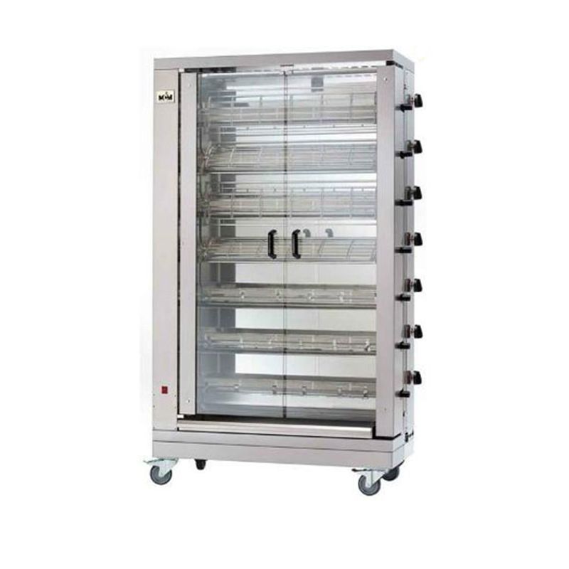 Dim: 1098*660*1860mm- Inox AISI 304- 11 broches (utile 900 mm) chacune pour 6 poulets (1,25 kg)- Double rangée de broches- Version sur roues (Diam. 100 mm)- Chauffage gaz par radiants céramiques.- Poids: 204KG- Puissance :0,17kw