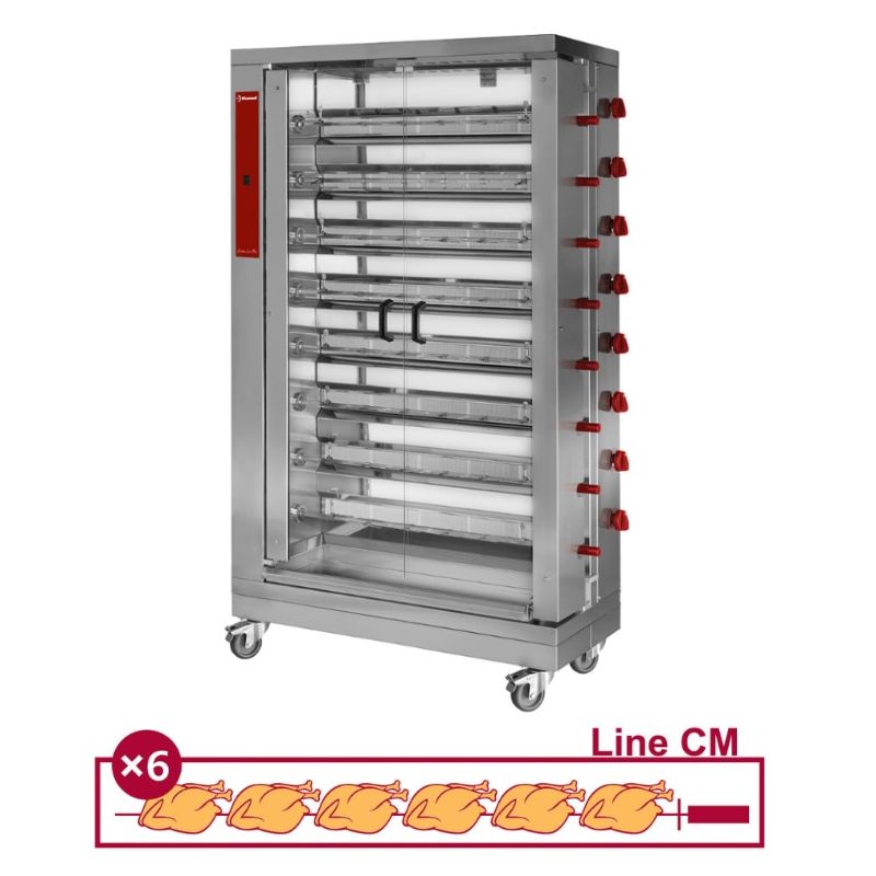 - Capacité 6 poulets par broche, toutes les broches sont livrées de série avec 2 pics terminaux et 4 intermédiaires, munie de poignée athermique