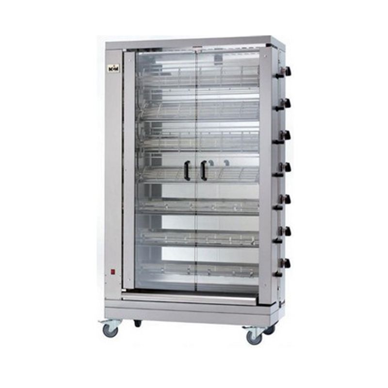 -Dim:870x530x722mm-Capacité:6 poulets-2 broches-Finition inox-Puissance:8kw-Tension:230V-Poids:80kg