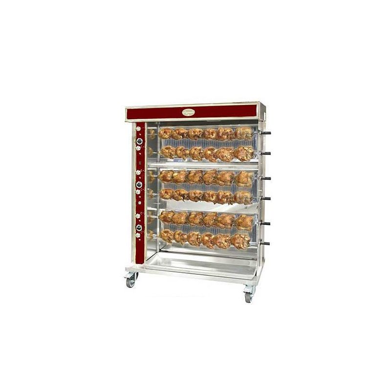 -Dim: 1340x620x1480mm -Capacité:36 poulets -6 broches -Finition inox -3 allures de chauffe -2 cuissons + maintien au chaud -Puissance:19.8kw -Tension:400V -Poids:168kg