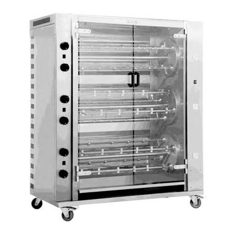 -Dim:870x530x722mm-Capacité:6 poulets-2 broches-Finition inox-Puissance:8kw-Tension:230V-Poids:80kg