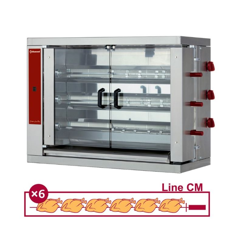 - Capacité 6 poulets par broche, toutes les broches sont livrées de série avec 2 pics terminaux et 4 intermédiaires, munie de poignée athermique
