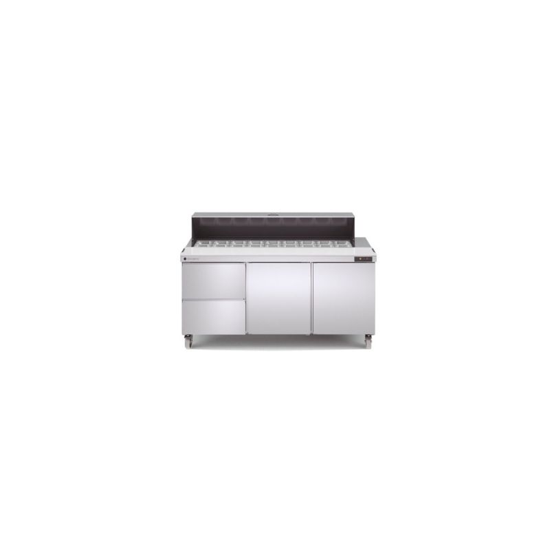 Dimensions (LxPxH): 1532x805x926 mm - T° : 0°C /+8°C / 32°F/46°F - Portes GN: 2 - Étagères: 4 - Plan de travail GN1/6-100 : 24 - capacité : 500 L - Type de fluide réfrigérant: R290 - puissance frigo :