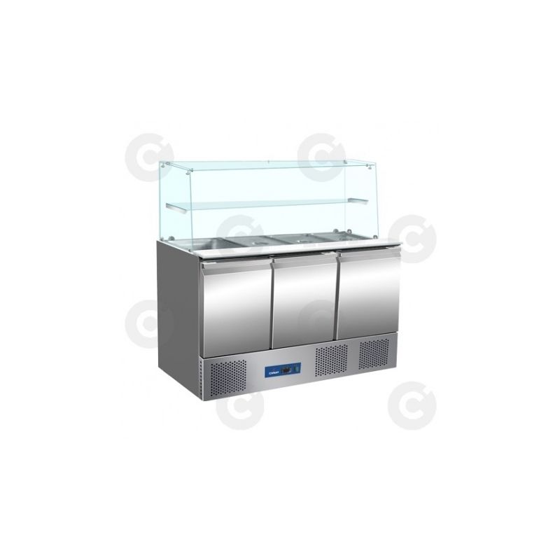 Dimensions (LxPxH) (mm) : 2020x600x850 Alimentation : 230/1/50 Disposition : Dessus inox Température (°C) : 0 / (+8) Porte : 3 Capacité : 12 bacs GN 1/4 Capacité (L) : 380 Gaz réfrigérant de série : R290