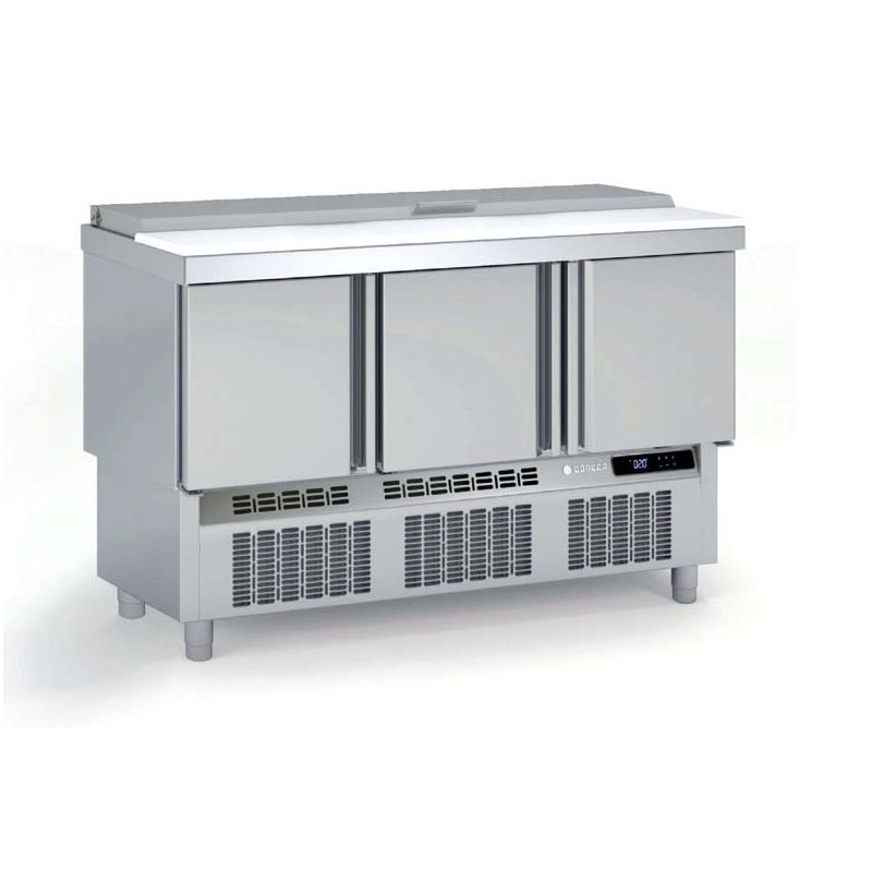 Cette Saladette Réfrigérée Positive 3 Portes dispose d'une capacité de 264 L et peut contenir 18 bacs GN 1/6 d'une profondeur de 200 mm et 6 bacs GN 1/9 d'une profondeur de 100 mm. Conçue en acier inox AISI-304, elle est solide et résistante. Sa plage de température est comprise entre 0 et 8 °C.