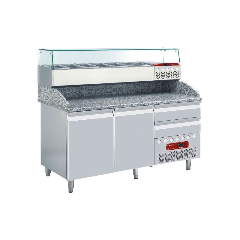 AISI304 pour intérieur et extérieur avec coin arrondi en bas pour un nettoyage facile Gaz réfrigérant R290 Avec plateau en acier inoxydable Tablette GN1/1 ou tiroir GN1/1 Dimensions intérieures des tiroirs 300x525 mm Profondeur maximum des bacs GN1/1 : 150mm Joint de porte magnétique remplaçable Température +2°C/+8°C Évaporateur dans la paroi 230 V Mono...