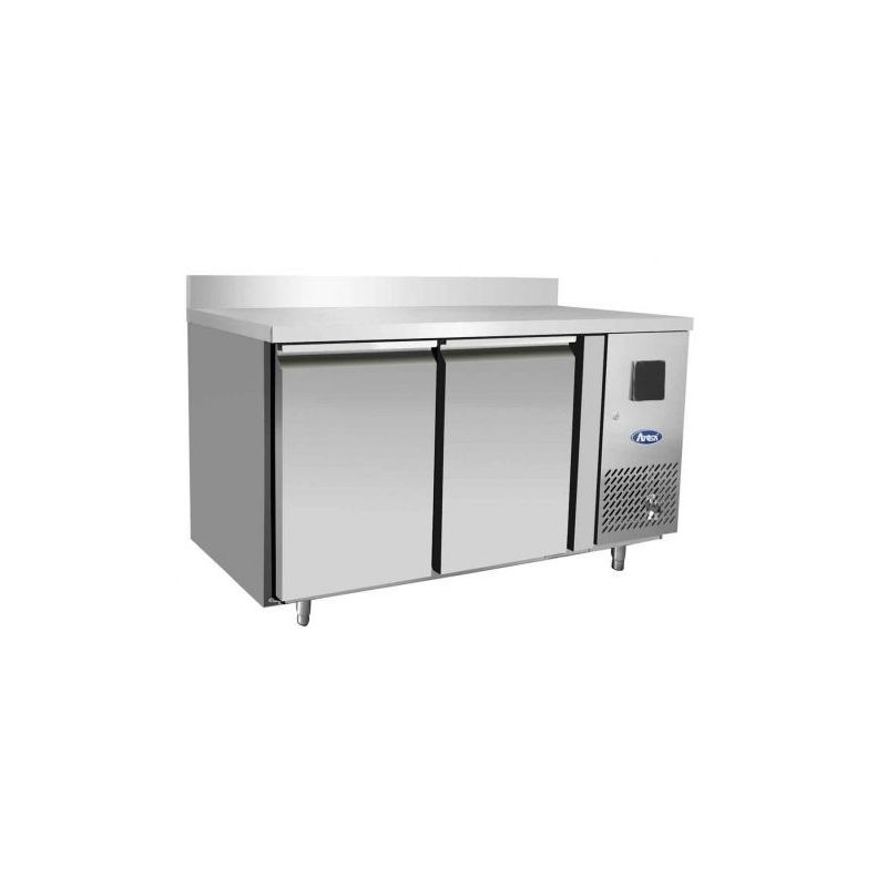 Table réfrigérée tropicalisée négative 2 portes d'une profondeur de 600mm avec dosseret et plan de travail en inox :