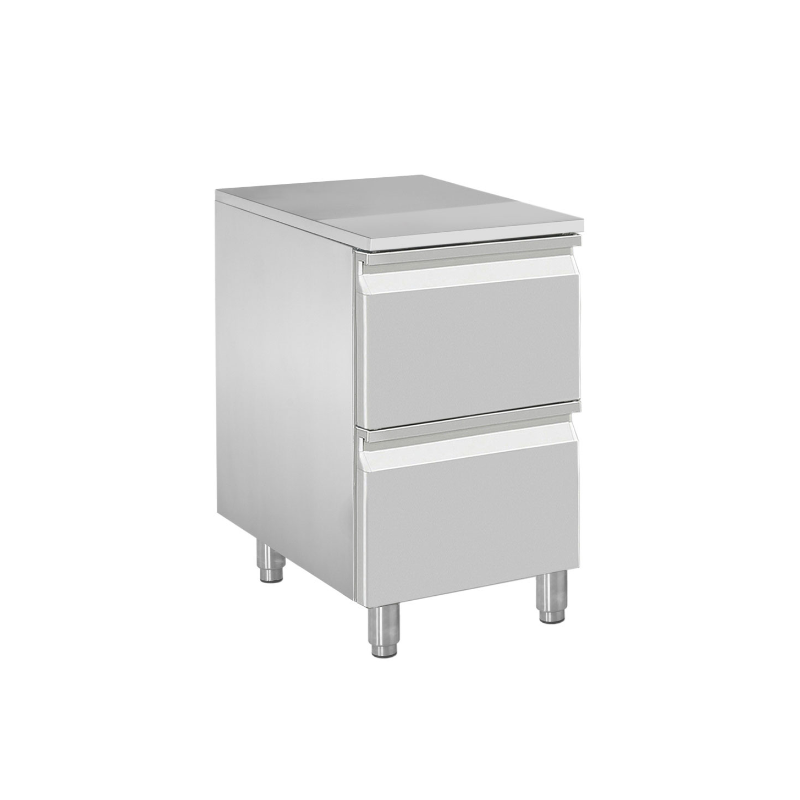 2 tiroirs neutres sur glissières télescopiques (capacité 2x 4 bacs 600x400 = total 8), hauteur maximale des bacs (70 mm).