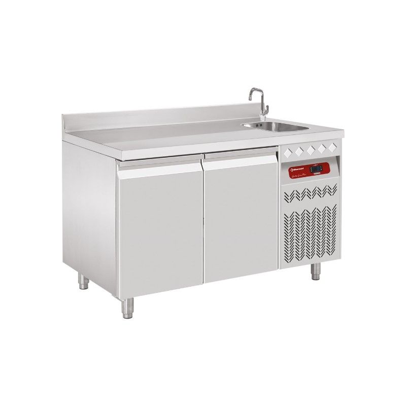 Evier 340x400xh200 mm incorporé sur le Top (à droite), doté de siphon, crépine et bonde de trop-plein (NB robinet sur demande, orifice sur le top (27 mm)