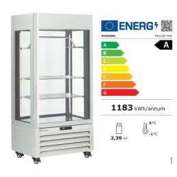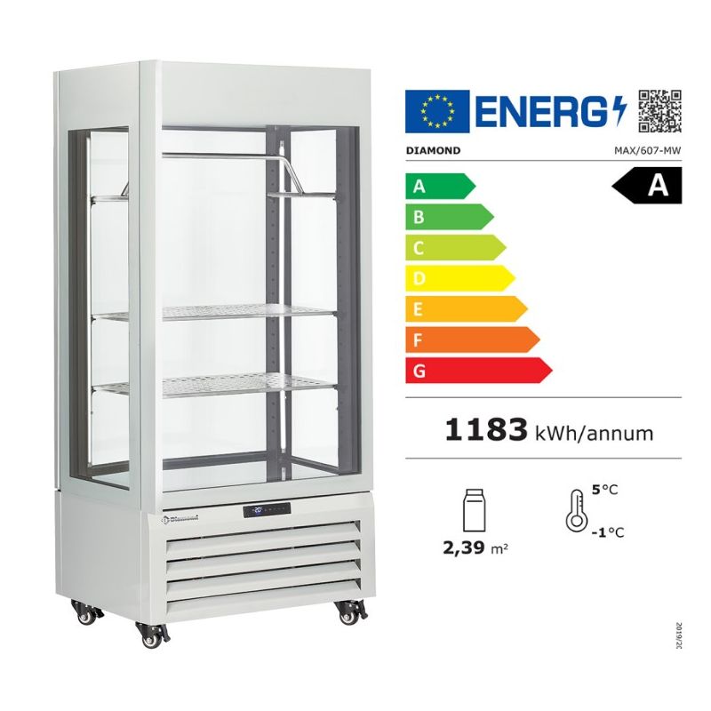 Réalisée en acier laqué BLANCHE et porte tout en verre avec sérigraphie BLANCHE.  5 étagères (réglables) en verre trempé 630x455 mm ) (EURONORM 400x600 et GASTRONORM 1/1).  4 éclairages internes de type LED. Réfrigération optimale grâce à l'évaporateur (ventilé) placé en partie supérieure de la vitrine.  Dégivrage automatique, avec auto évaporation du...