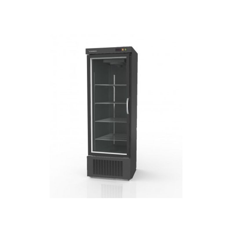 Vitrine incurvée sur le devant et structure noire. Capacité 100L Eclairage intérieur LED 2 Etagères réglables